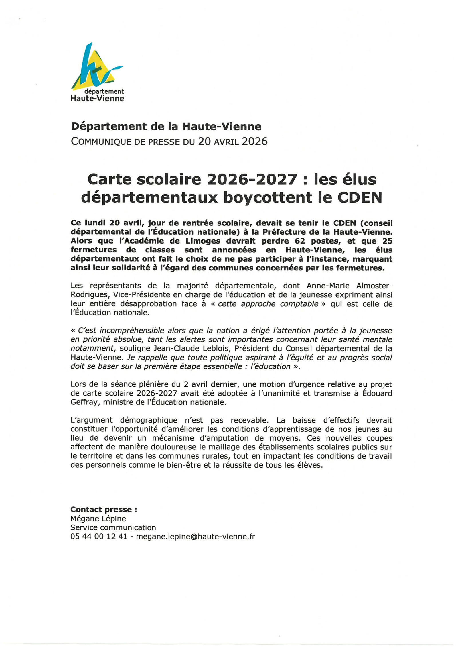 Communiqué de presse du Conseil Départemental